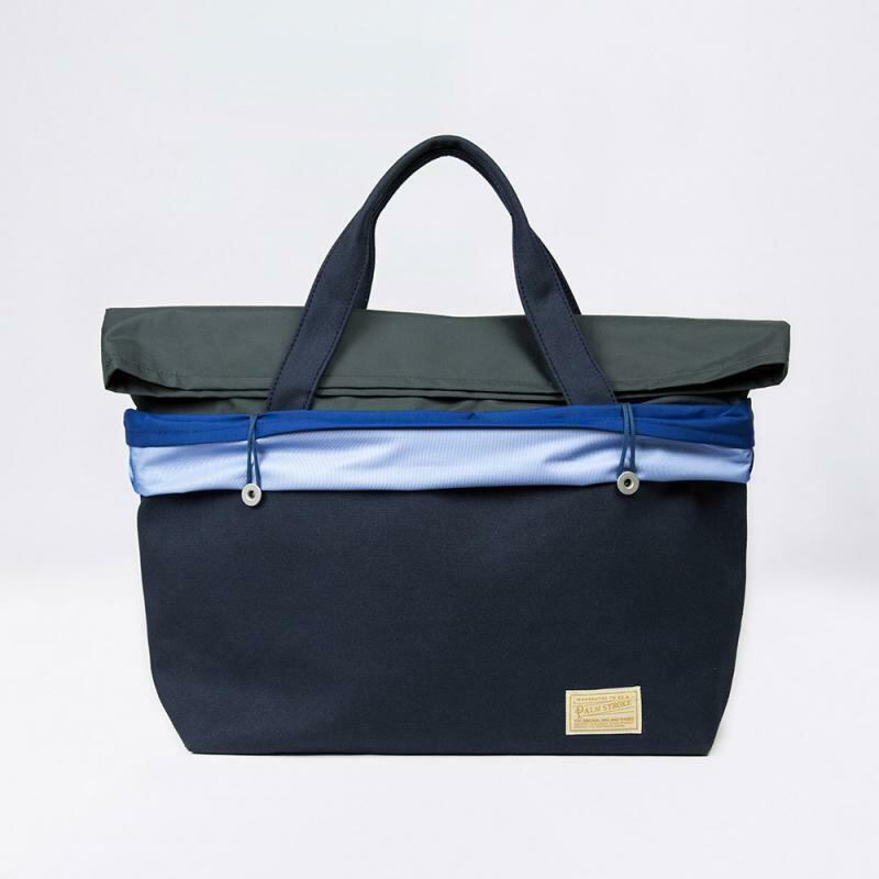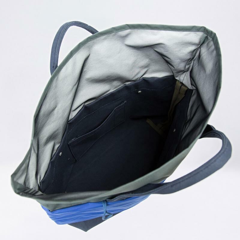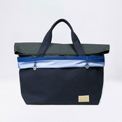 また撥水素材を上げて紐で止め、口の部分の生地をおりこむ事により、また違った見え方も楽しめ、BAG内の目隠しになります。