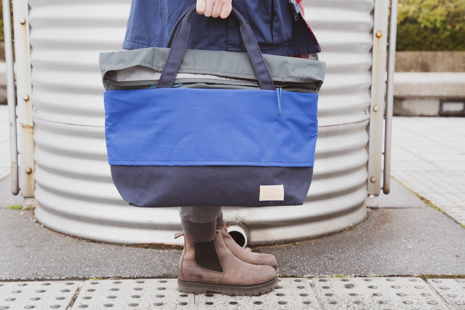 また撥水素材を上げて紐で止め、口の部分の生地をおりこむ事により、また違った見え方も楽しめ、BAG内の目隠しになります。